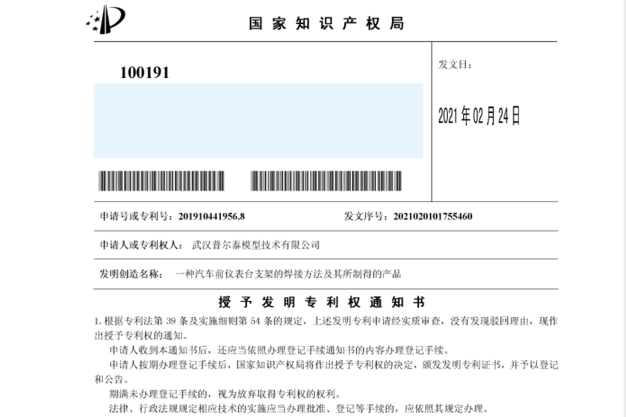 近日,普尔泰模型一项发明专利获得国家知识产权局授权,此...